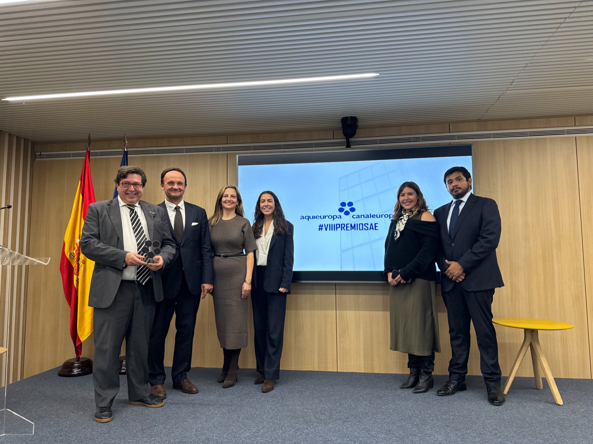 Finnova Foundation has been honoured with the Aquí Europa Award for its outstanding contribution to European construction, innovation, and international cooperation. The ceremony took place at the Permanent Representation of Spain to the European Union (REPER) in Brussels, presided over by Spain's Minister for Foreign Affairs, European Union and Cooperation, José Manuel Albares. Juan Manuel Revuelta, CEO of Finnova, received the award accompanied by Frédérik Leloup, President of the Foundation.
