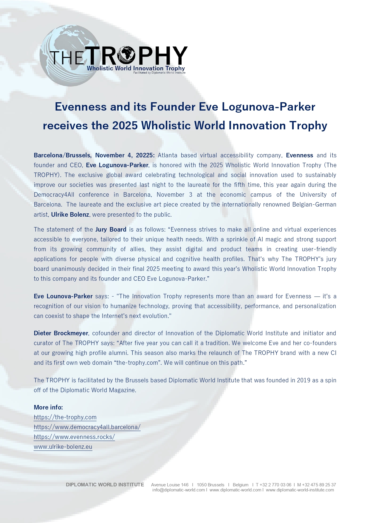 Barcelona/Brussels, Nov 4th, 2025 - Evenness and its Founder Eve Logunova-Parker